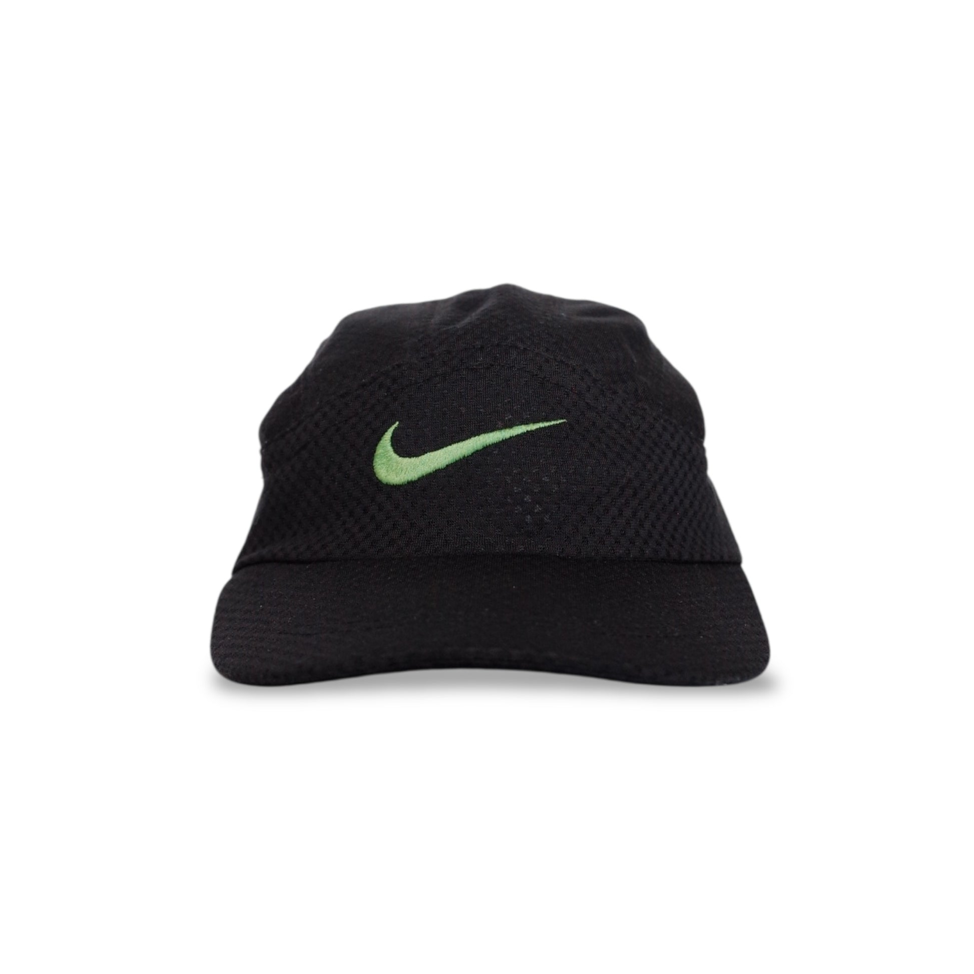 Nike 5-panel cap from the early 2000s in black, featuring a classic low-profile silhouette with adjustable strap at the back for a comfortable fit. A timeless streetwear accessory in great condition.